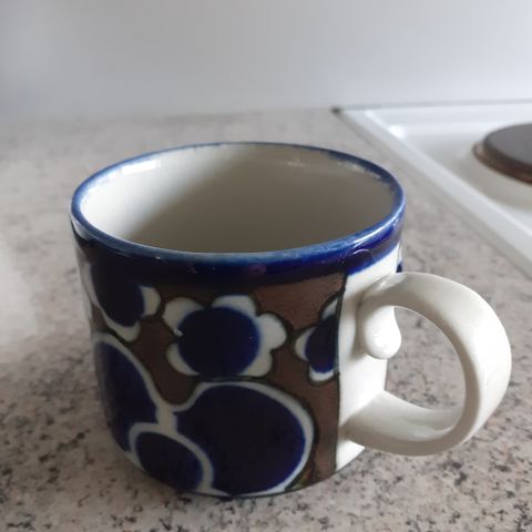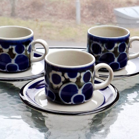 Arabia Saara kahvikupit 4 kpl, kupin korkeus 5,8 cm, halkaisija 6,5 cm ja asetti 13,5 cm. Suunnittelija Anja Jaatinen-Winwuist, tuotannossa 1971-1976.