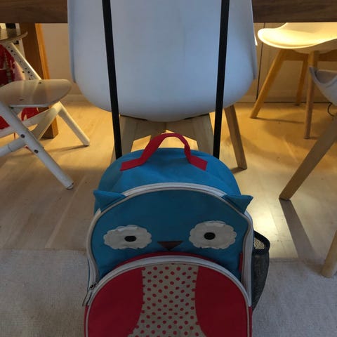Siisti lasten matkalaukku vetoaisalla ja renkailla. Etutasku, ja taskun sisällä erillinen verkkotasku. Sivussa verkkotasku. Vetoketjut toimii ja laukku on ehjä. Nimikyltti irrotettu.