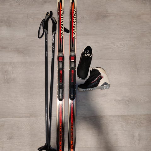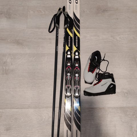 Suksipaketti. Sukset 120, sauvat 95, monot 31,5