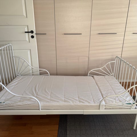 • ihana Ikean keltainen Minnen-sänky, jonka saa kolmeen eri pituuteen (kuvissa keski- ja lyhytmittaisena) + puinen sälepohja