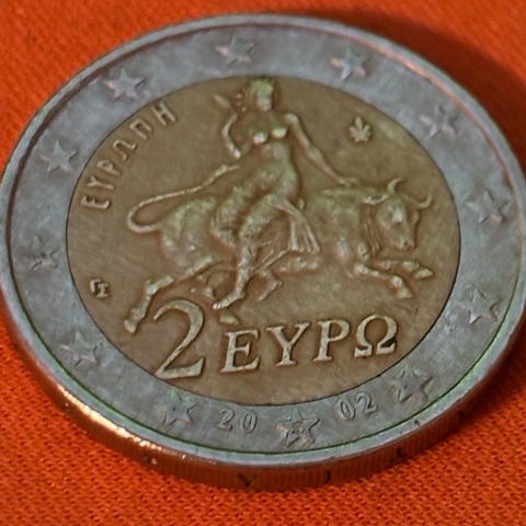 Myynnissä kahden euron kolikko. Käytön jälkiä löytyy, mutta hyvässä kunnossa.