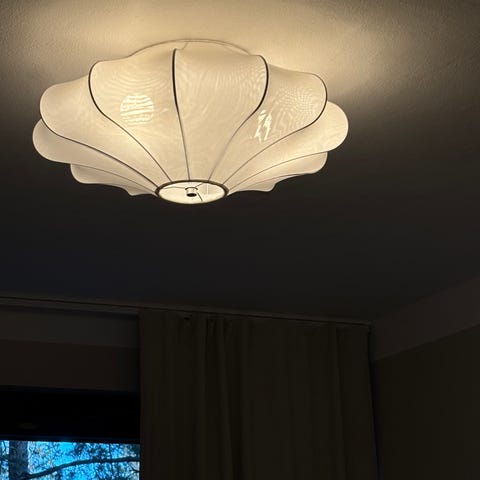 Hieno neliönmuotoinen kattovalaisin, jossa on roikkuvat prismat. Lampun koko on 30 cm x 30 cm. Peilaava hopeanvärinen pohja, josta prismat lähtevät. Valaisimen runko on valmistettu metallista, ja se on suunniteltu kiinnitettäväksi kattoon. Sopii sisätilojen valaistukseen. Lampun korkeus n. 23 cm. Hinta 25 e.