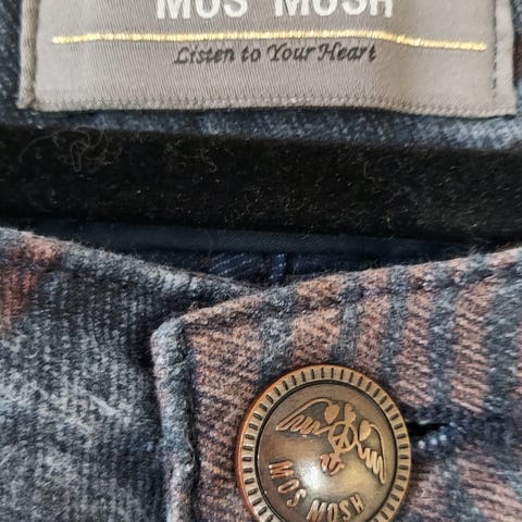 Tummanharmaat, kiiltäväpintaiset Mosh Moshin Ozzy Biker-housut. Koko 25. Vyötärönauhan kohdalla kulumaa, ks kuva. Muutoin kunto hyvä.