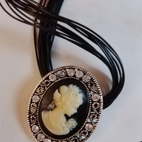 Mustat lasin tuntuiset helmet, jossa iso muovinen riipus. Ketjun päässä muovinen tähti.