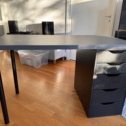 IKEA työpöytä, jossa vaalea puupinta. Sopii monenlaiseen työskentelyyn ja tarjoaa tilavan pöytälevyn useille näytöille ja tarvikkeille. Mahtuu kaksi työpistettä vierekkäin tarvittaessa.
