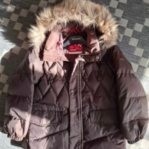 Hyväkuntoinen talvitakki jossa on vain vähän naarmuja takapuolella.
