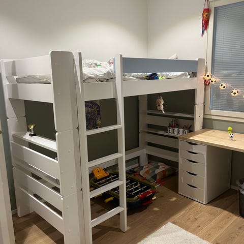 Sängyn tikkaat, turvalaita ja "välihyllyt" ostettu uutena, parven alaosa ja sänky käytettyinä. Tämän vuoksi sängyssä on hienoinen sävyero, joka ei käytössä kuitenkaan pistä silmään.