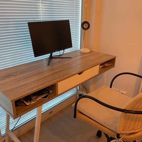 Myydään hyväkuntoinen Jyskin työpöytä. Pöytä on täysin ehjä, kannessa hienohkoa naarmua, joka näkyy kuvassa. Pöydän alla on pieni kouru, johon saa johdot piiloon. Vain nouto Töölöstä. Mallia ei myydä enää Jyskissä, OVH ollut noin 100€.