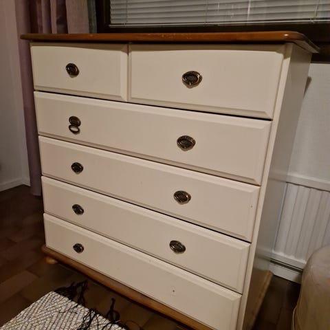 Normaalia pienempi syvyydeltään, mutta yllättävän tilava lipasto. Ei puinen. Meille väärän värinen ja kokoinen.