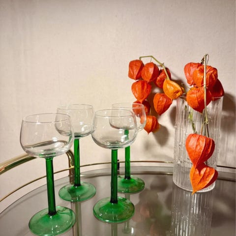 Punainen ja keltainen Luminarc lasi. K 10 cm, halkaisija 6 cm ja tilavuus 15 cl