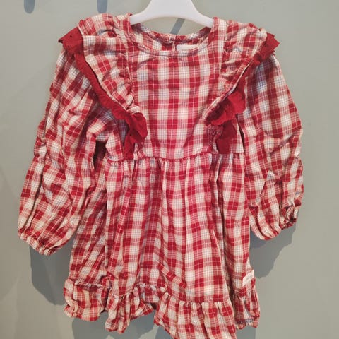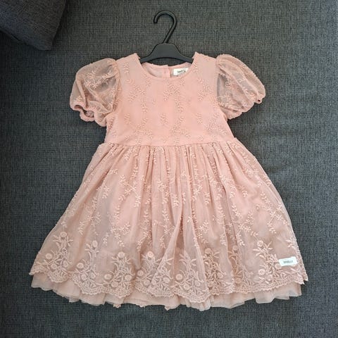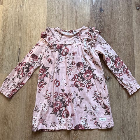 Vain yksissä juhlissa käytettynäkin kaunis Newbien frillamekko ruusukuosilla koossa 98cm. Takana napit ja olkapäillä frillat.