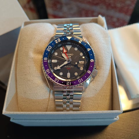 Myynnissä käyttämätön Seiko 5 Sports GMT jossa on 3 vuoden takuu. Ostettu 19.11.2025, suoja muovit on vielä kiinni ja ranneketta ei ole lyhennetty. Mukaan tulee kelloboksi ja takuukortti.