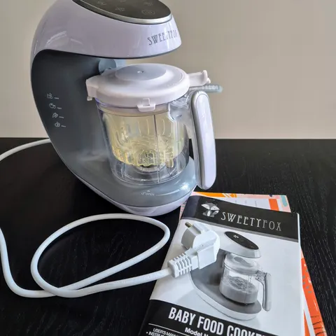 Tällä valmistetaan näppärästi vauvalle soseet ja smoothiet. Kannussa jälkiä, muuten täysin toimiva laite.