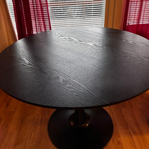 Valkoinen pyöreä pöytä halkaisijaltaan 100 cm. Pöydässä käytön jälkiä ja normaalia kulumaa, ks. kuvat.