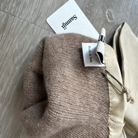 Samujin sample-myynneistä ostettu iso kashmirhuivi. Kamelin sävyinen. Ei labelia. Koko noin 72cmX214cm. Pientä kashmirille tyypillistä nukkaa pinnassa, poistuu huollolla. Reikä huivin toisessa päässä, korjattavissa.