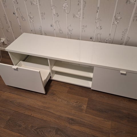 Myydään tv-taso, runko metallia, taso akasianväristä puuta. Korotettu renkailla.