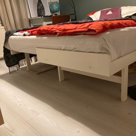 Vierashuoneeseen tai mökille lähes käyttämätön laverisänky patjoineen. Levitettynä noin 150cm. Sängyn pituus 190cm. Päiväpeitto ei kuulu hintaan.