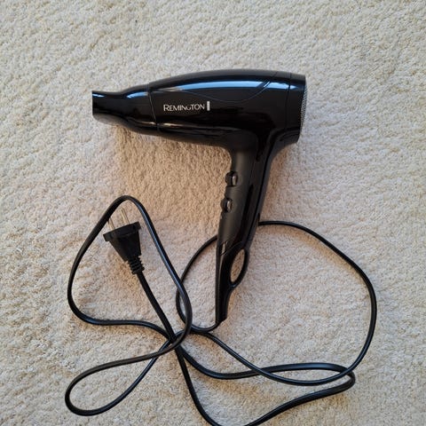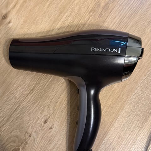 Remington hiustenkuivain musta / hopea. Toimii moitteettomasti, toki pientä käytön jälkeä löytyy, mutta ei haittaa laitteen käyttöä.