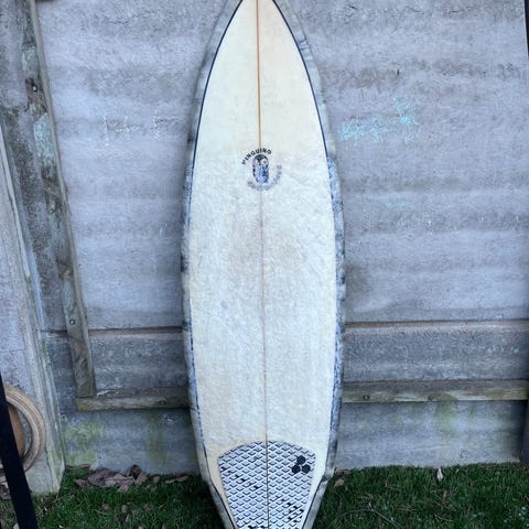 Pinguinon semi step-up surffilauta, joka sopii hyville aalloille. Dingejä tullut ja korjattu, materiaali PU. Litroja 30+.