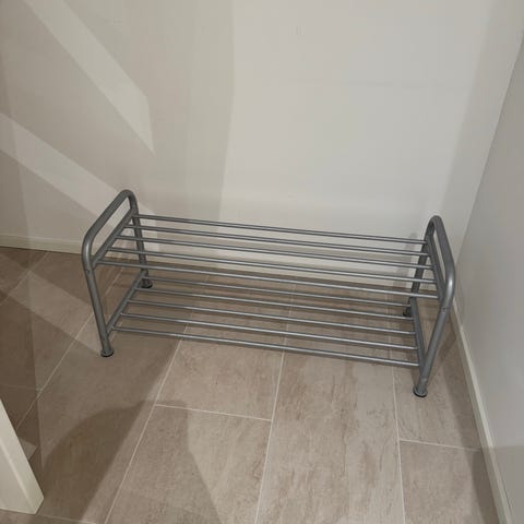 Jyskin kenkäteline, kaksi hyllyä. Kunto erittäin hyvä. Mitat L92 x K39 x S35 cm.