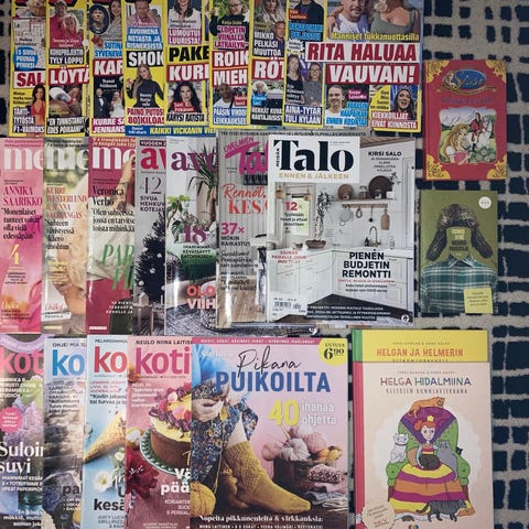 Myytävänä sekalainen kasa kirjoja ja lehtiä.