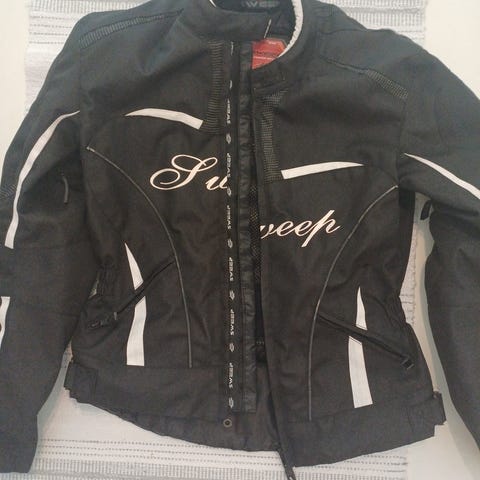 Sweep ajotakki ja -housut. Koko 36, sopii noin 170-175 pitkälle, hoikalle naiselle. Mustat, takissa valkoisia koristeraitoja. Istuu hyvin, säädettävä. Vedenpitävä. Puku on uusi, mutta jäänyt tarpeettomana käyttämättä. Laput paikoillaan.