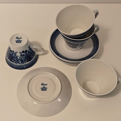 Kuppeja on kaksi, asetteja neljä. Kaikki yhteensä 22 euroa. Kuppi+asetti erikseen 11 euroa.
