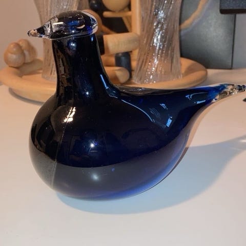 Oiva Toikan suunnittelema ja Nuutajärven lasin tekemä Kajava lintu. Valmistettu vuosina 1983-1994.