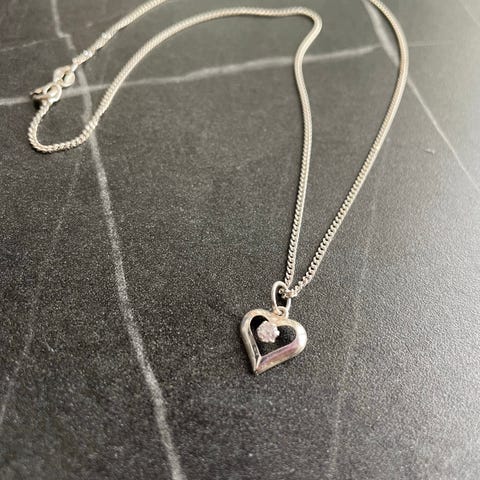 Hopeinen (925) sydän kaulakoru. Ketjun pituus 44 cm, riipuksen halkaisija n. 1 cm.