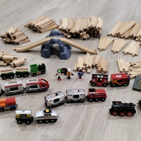 Myydään junarata. Ylhäällä olevat palat ovat Brio-merkkisiä ja alhaalla olevat on Ikean paloja. Palat sopivat yhteen. Pattereilla toimivat junat eivät ole enää uudenvertaisia. Muutoin kaikki täysin ehjiä ja toimivia.