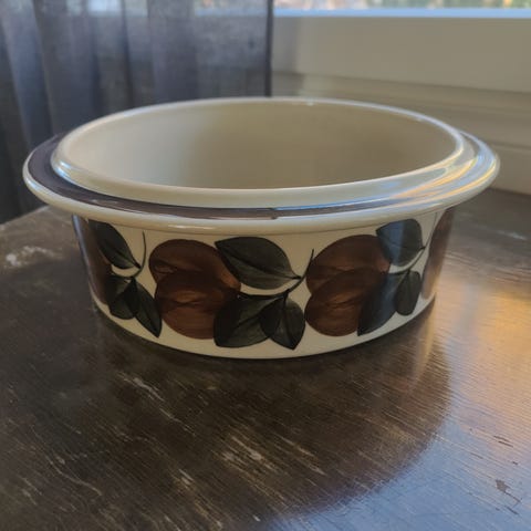 Arabia Ruija muki, jossa ruskea lehtikuviointi. Posliinimateriaali. Käytetty astia, soveltuu juomien tarjoiluun.