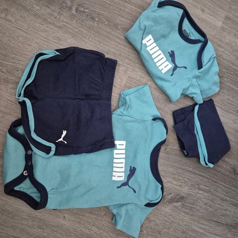 Puma set: shorts and T-shirt, size 68, 6-9 months. Used, but in good condition. Print in the T-shirt has minor signs of wear (shown in the picture). Otherwise clean and intact, no holes, no stains. Non-smoking household. Pick to from Kivistö / shipping with ToriDiili.