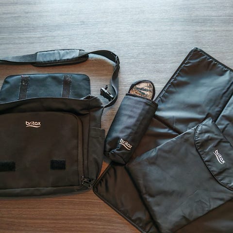 harmaa hyväkuntoinen laukku, tilava, paljon taskuja, termospullo pullolle ja vaipalle