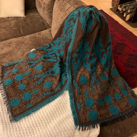 Tummasävyinen pitkä kaulahuivi, villaa. Suomalaisen Elina Leonin käsialaa. Hieno kuviointi. Toimii myös shaalina. Ei ole ollut juurikaan käytössä.