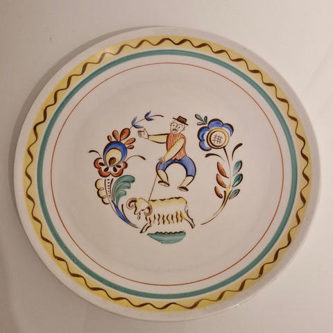 Arabia Talonpoika lautanen, halkaisija 25 cm. Lautanen on valmistettu posliinista ja siinä on värikäs koristekuvio, jossa on kukkia ja hahmo. Lautanen soveltuu kattaukseen ja koristekäyttöön.