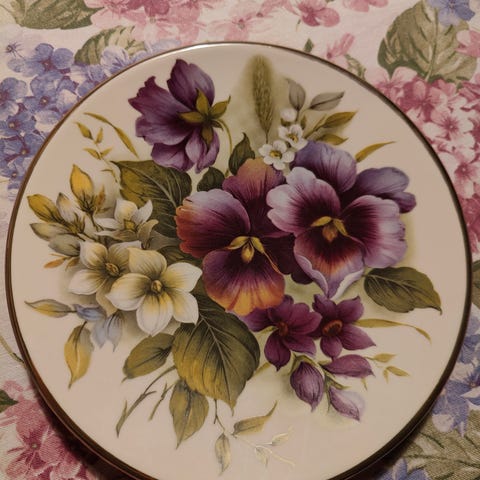 Kermansaven sisustustaulu Kukkiva puutarha. Kultareunus. Ruokalautasen kokoinen.