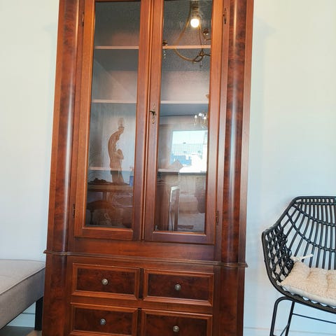 Valkoiseksi maalattu, kaunis antiikkinen kaappikello, josta tehty vitriinikaappi. Tähän saa kauniisti esille esim pieniä koriste-esineitä tai muuta.