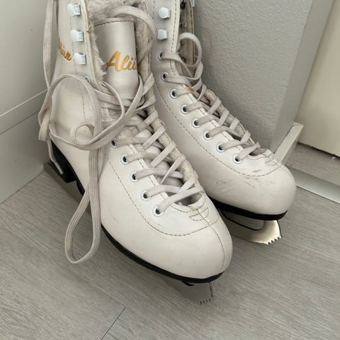 Aliisa lasten luistimet koko 32, valkoinen väri. Tuntuvat vielä teräviltä, ei montaa kertaa ehtinyt jalkaan. Ei ruostetta.