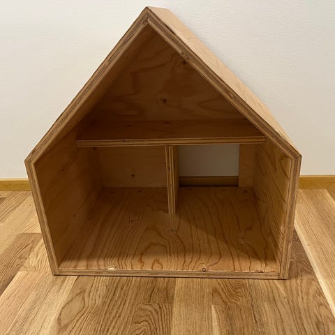 Puinen nukkekoti kalusteineen, uudenveroinen kunto. Maalattua MDF materiaalia. Koko 18cm x 38cm x 46,5cm.