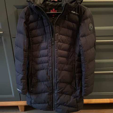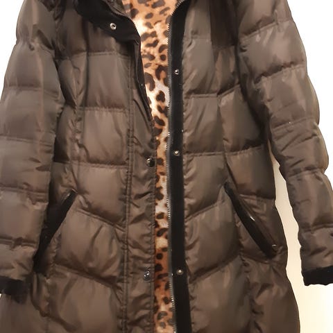 Hyväkuntoinen, lämmin ja muhkea untuvatakki. Kainalo-kainalomitta 55cm, olka-helmapituus 105cm.