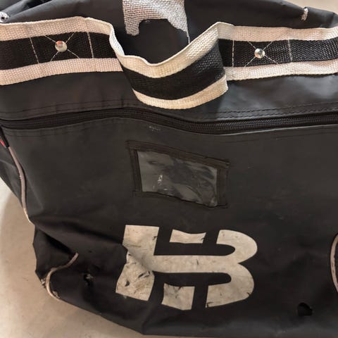 Juniorikoon varustekassi. Korjailtu. Vetoketjut toimii. Rullat alla.