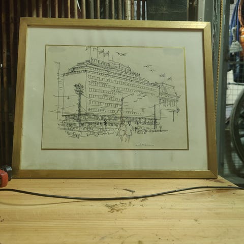 Erittäin yksityiskohtainen kuva täynnä aikakauden purjelaivoja ja kaupungin siluettia. Painettu laadukkaalle, tarkoituksella patinoidulle paperille. Valmiiksi kehystetty, sopii hienosti esim. sisustuselementiksi. 68x40cm. omaa hintaa saa ehdottaa.