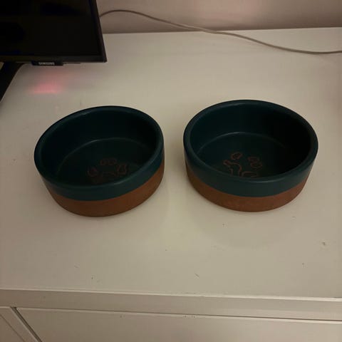 Kind for dogs -merkin kotimaiset tyylikkäät posliiniset koiran kipot myytävänä koiran menettämisen takia. Sisällä hieman jälkiä lusikasta.