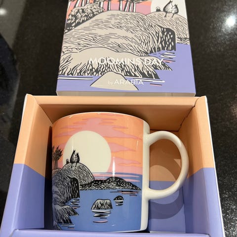 Kolme muumimukia, Muumin päivä-mukit vuosilta 2021 ja 2024 sekä Vuorilla muki. Kaikki ovat uusia, vain kaapissa säilytyksessä olleita. Tarrat ja lappuset edelleen paikallaan.