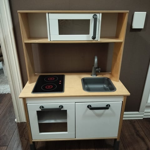 IKEA lasten leikkikeittiö valkoisena. Sisältää keittolevyt, uuni, pesuallas ja hyllytilaa. Mukana erilaisia muovisia keittiötarvikkeita ja leikkiruokia. Soveltuu lasten leikkeihin ja roolipeleihin.