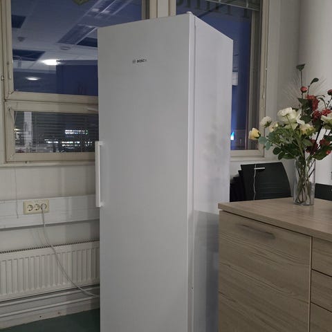 Bosch jääkaappipakastin valkoisella värillä. Sisältää useita hyllyjä ja laatikoita elintarvikkeiden säilytykseen.