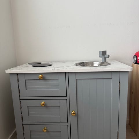 Lasten leikkikeittiö, jossa on puinen rakenne, liesi, uuni, tiskiallas ja yläkaappi. Mukana tulee posliini astiasto, muoviset lasit ja essu.