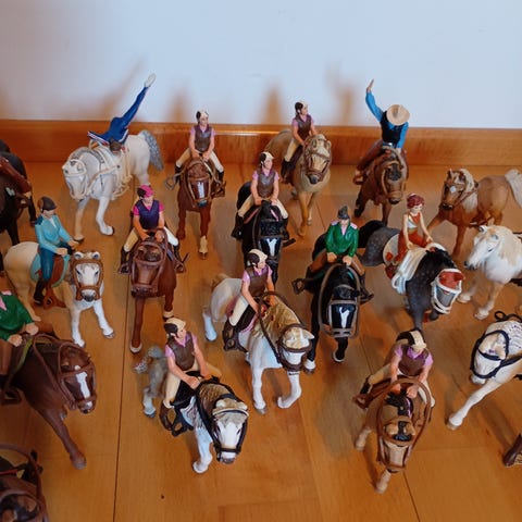 Schleich friisiläinen hevonen Myrsky, ratsastaja Krisella, Ella, Peppiina, Hilma /Peppiina nuorena, Johanna eläinlääkäri ja Anni tallin omistaja.