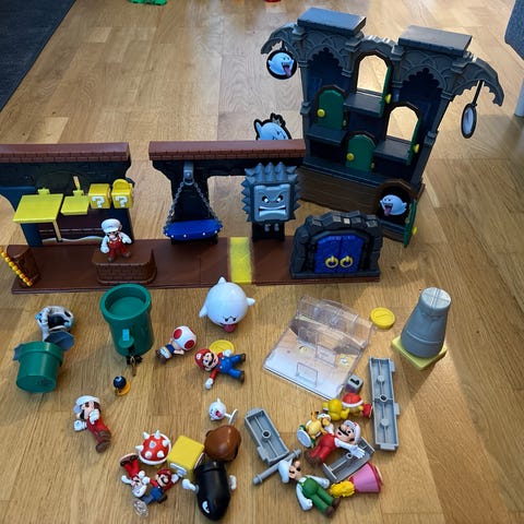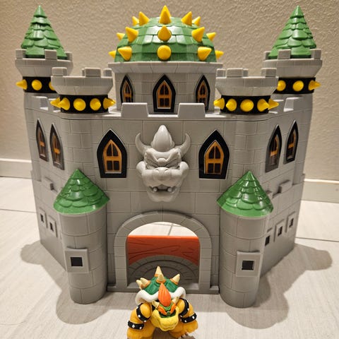 Super Mario Bowserin linnoitus. Linnassa on äänet ja ansoja. Kaikki toimii. Mukana figuureita.