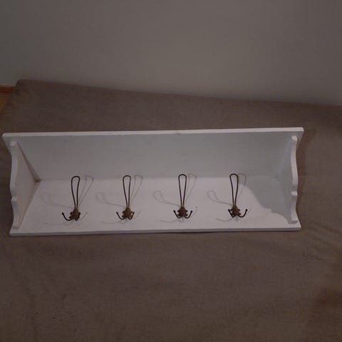 Vanha naulakko (arviolta 70-80-luvulta), jossa puinen taso ja mustat metalliset kiinnikkeet. Hyllyn mitat ovat noin 80 cm leveys ja 27 cm syvyys. Korkeus n. 10cm.